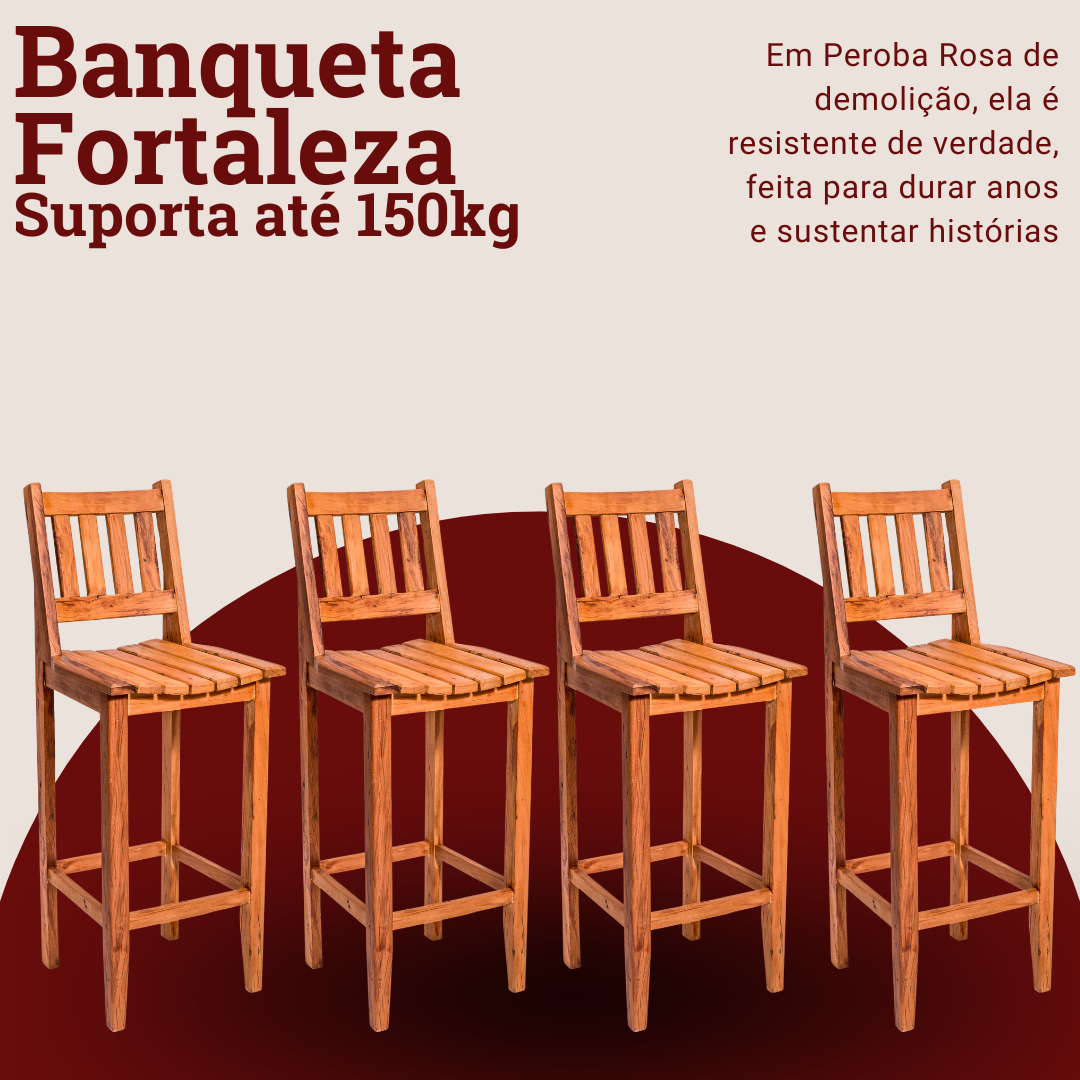 Kit com 4 Banquetas Fortaleza, com assento curvo e ripado e encosto ripado com aberturas laterais. Um modelo que combina com todos os tipos de mesa trazendo riqueza de detalhes.