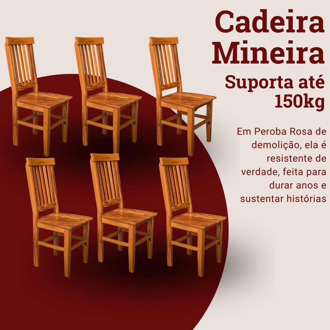 Kit com 6 Cadeiras Mineira, com assento liso e encosto ripado que proporcionam conforto sem igual. Nossa campeã de vendas é a queridinha dos clientes há 14 anos.